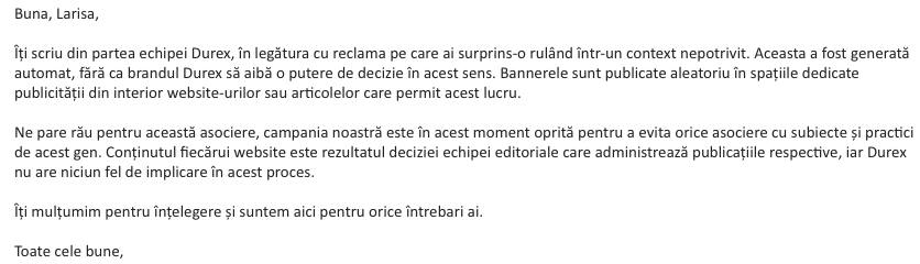 Durex a explicat într-un mesaj că este vorba doar de o suprapunere întâmplătoare. Din fericire pentru brand, incidentul nu a fost colportat online, însă senzația lăsată de contextul creat nu trebuie trecută cu vederea.