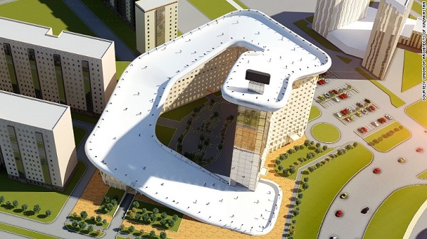 Shokhan Mataibekov, schior înrăit și membru al Uniunii Arhitecților din Kazakhstan, a gândit clădirea cu pârtie de schi pe post de acoperiș, numită Slalom House, care servește ca suport pentru o pârtie de schi.