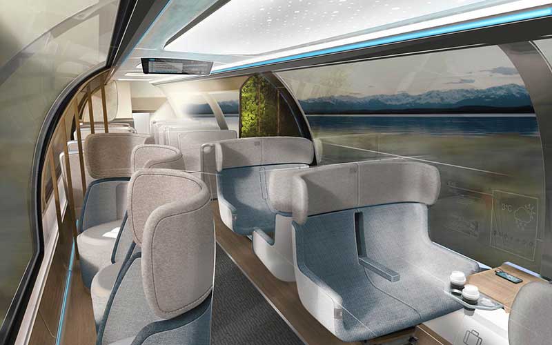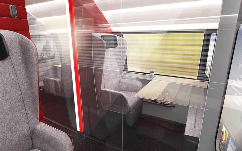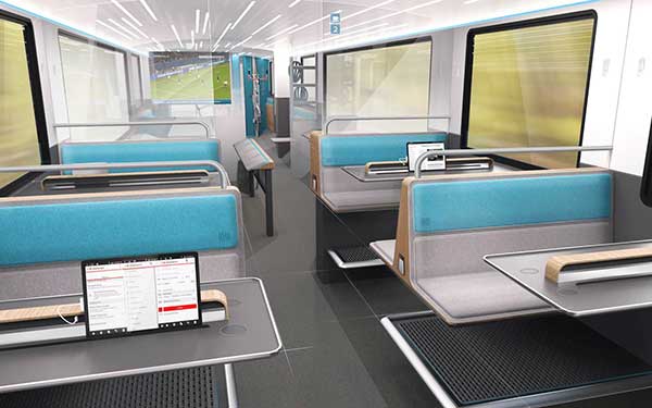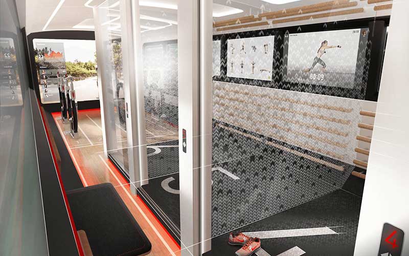 Foarte interesant mi ase pare conceptul de compartiment de sport: în loc să stai așezat, îți poți face rutina de mișcare de dimineață chiar pe tren, în drum spre serviciu. Alte imagini prezintă stații de încărcare a bicicletelor electrice, compartimente cu biciclete statice, compartiment cu asistent personal digital (un ecran mare la care vezi exercițiile fizice pe care trebuie să le faci), compartiment izolat de restul vagonului printr-un perete din sticlă, așa cum sunt unele locuri în avion, ba chiar cei care suferă de rău de mișcare își pot întoarce scaunul în orice direcție, astfel încât naveta să nu mai fie un calvar, ci o experiență plăcută.